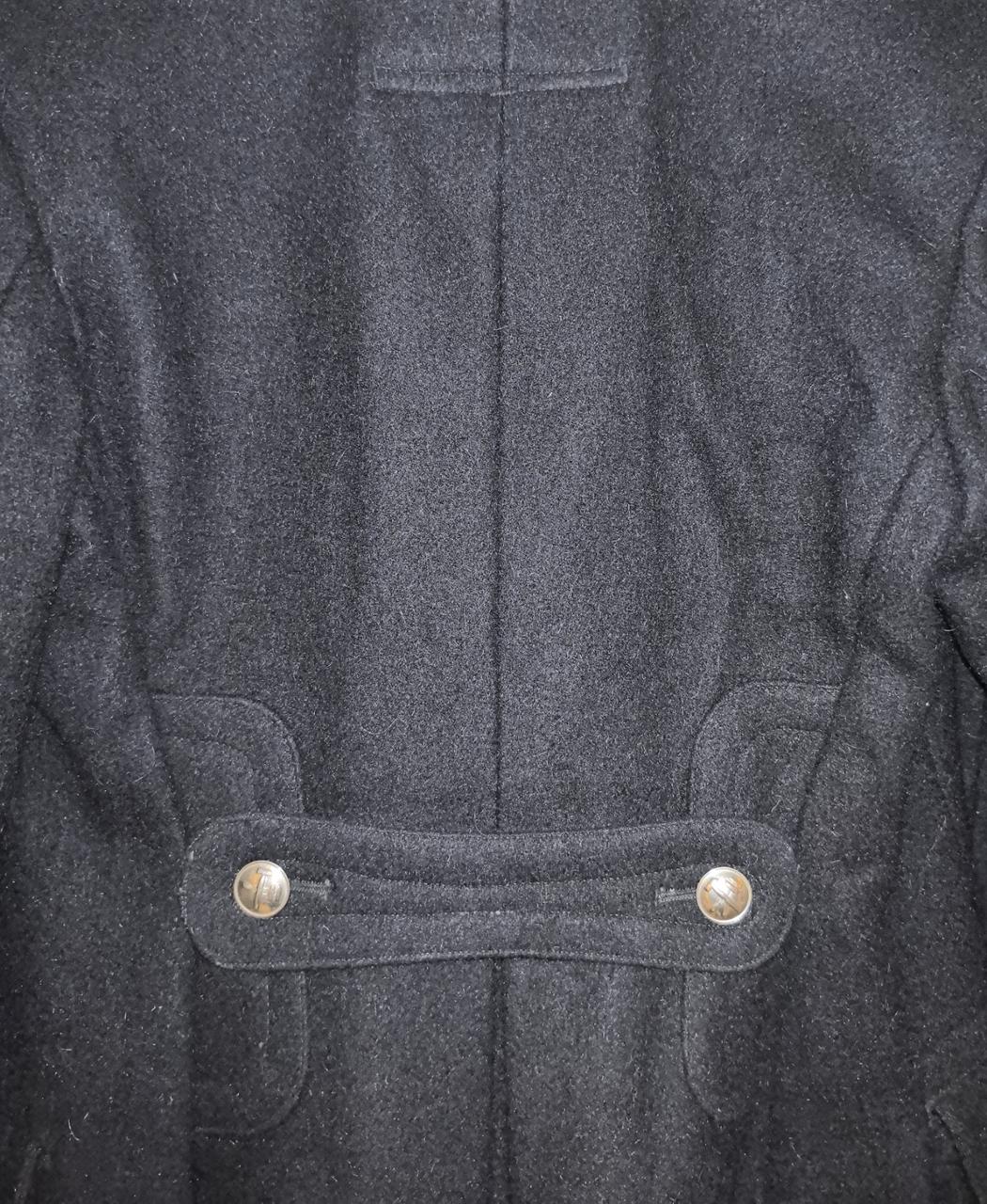Сзади, внизу спинки — разрез (шлиц), застёгивающийся на 4 посеребрённых пуговицы малого размера.