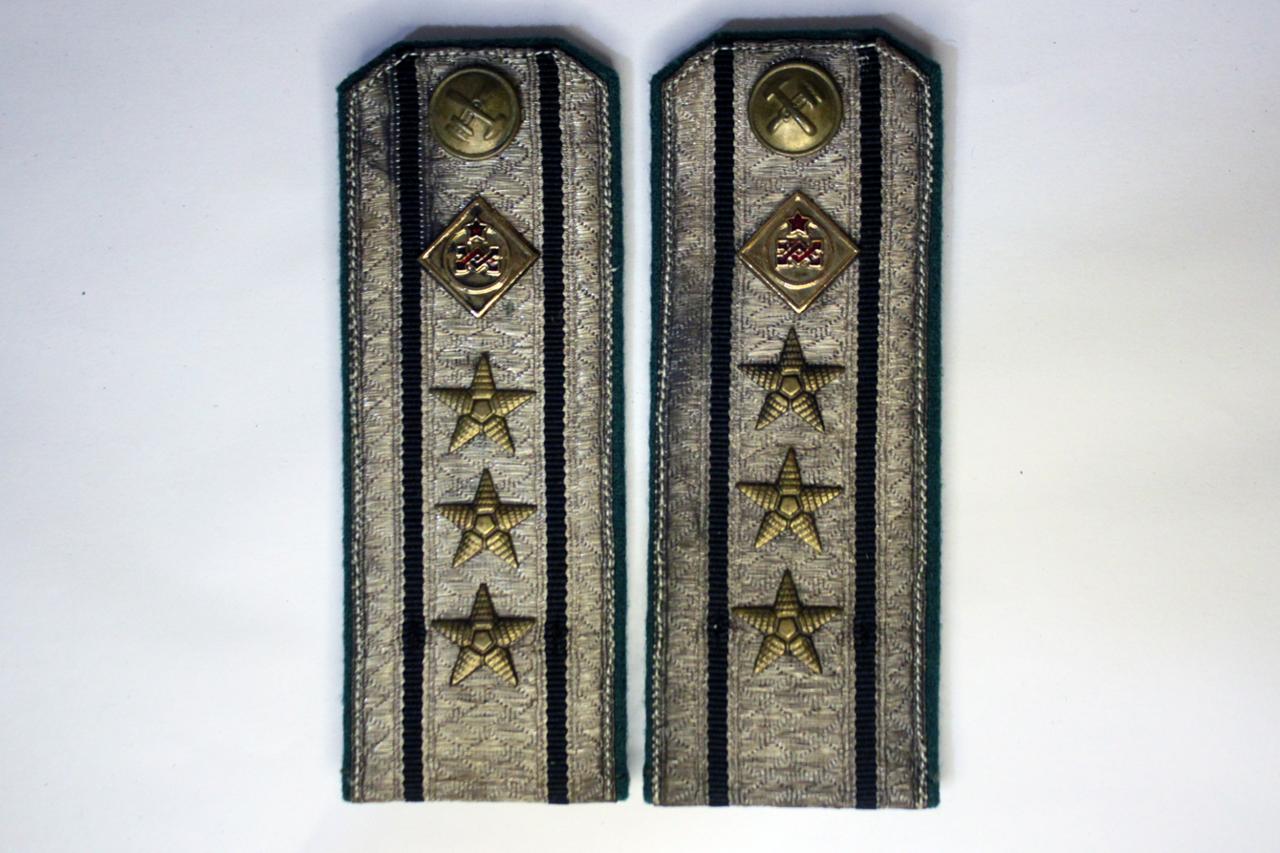 Пуговицы на погоне с установленной эмблемой (скрещённые французский ключ и молоток) металлические, золочёные, диаметром 1,8 см.