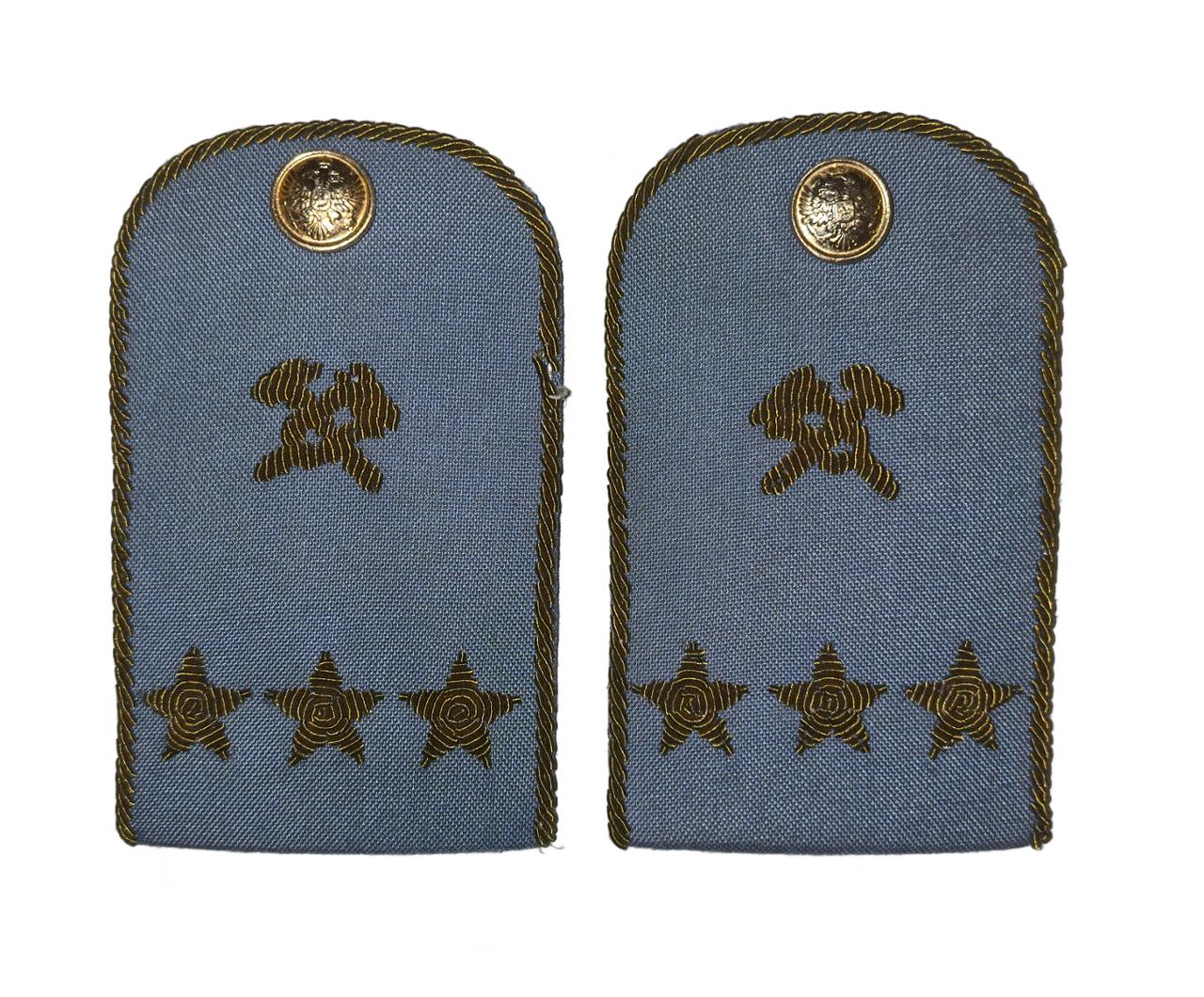 Наплечные знаки для старшего, среднего, младшего начальствующего и рядового состава изготовляются из той же ткани, что и форменный костюм , серо-голубого или темно-синего цвета.