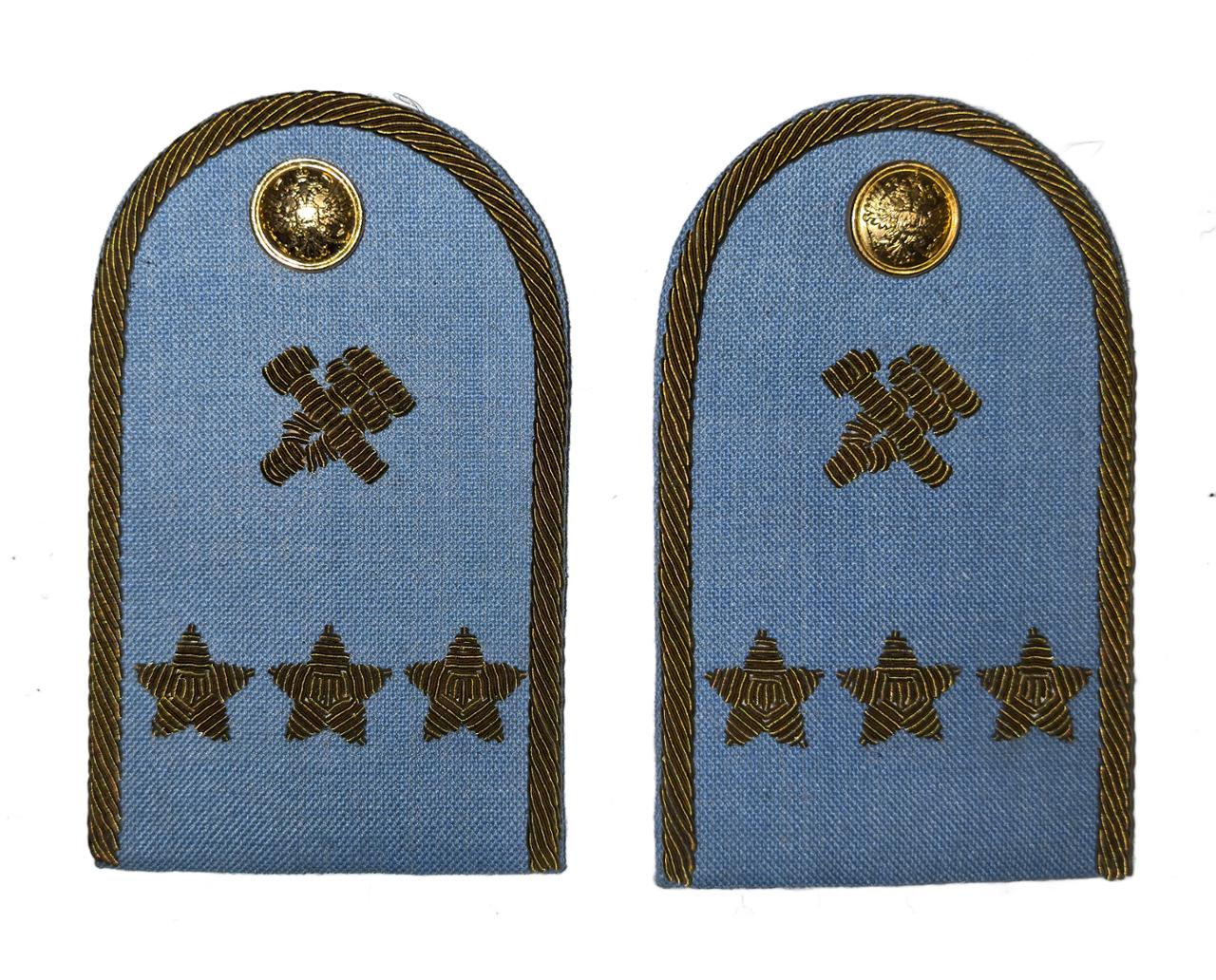 Наплечные знаки для старшего, среднего, младшего начальствующего и рядового состава изготовляются из той же ткани, что и форменный костюм , серо-голубого или темно-синего цвета.