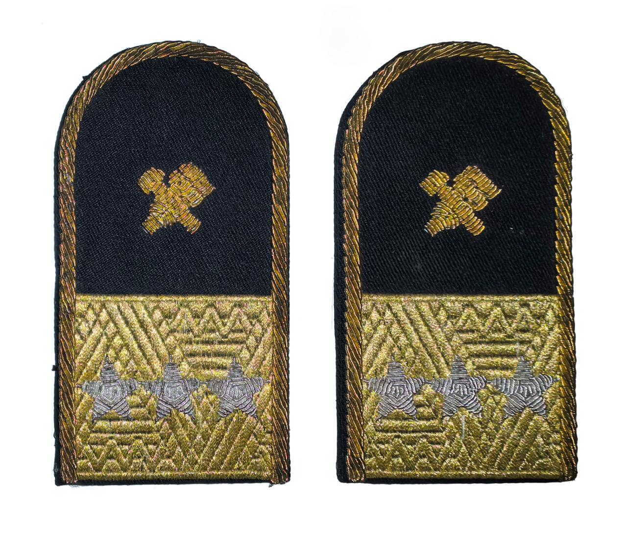 Размер и форма наплечного знака аналогичны полупогону для высшего начальствующего состава. С трех сторон, кроме основания, наплечный знак обшивается кант ом из сукна зеленого цвета шириной 3 мм.