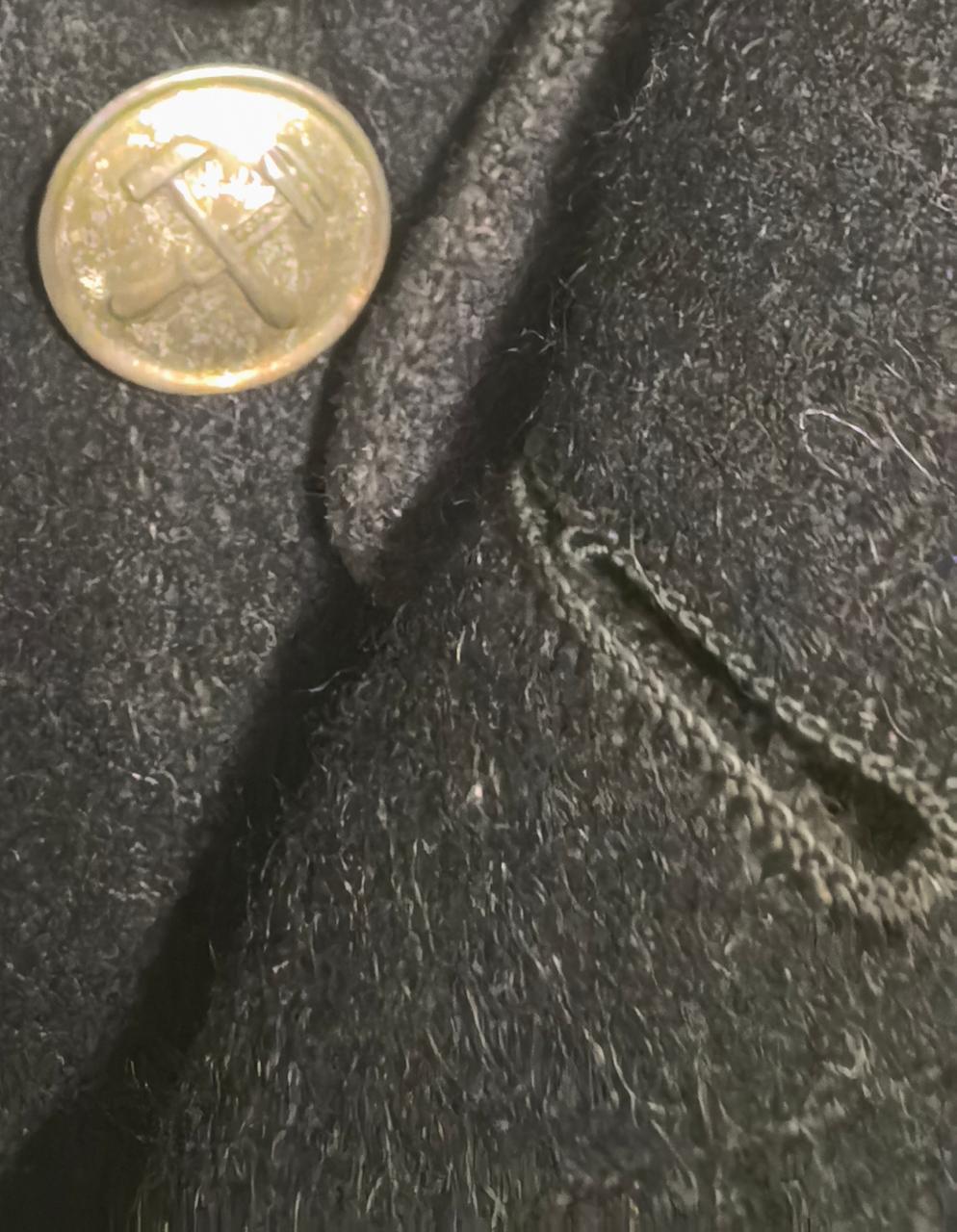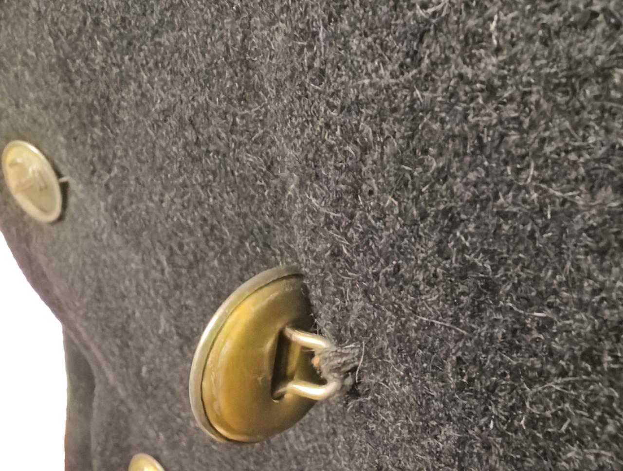 Сзади, внизу спинки — разрез (шлиц), застёгивающийся на 4 посеребрённых пуговицы малого размера.