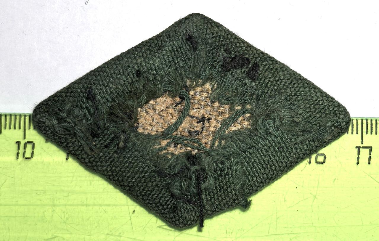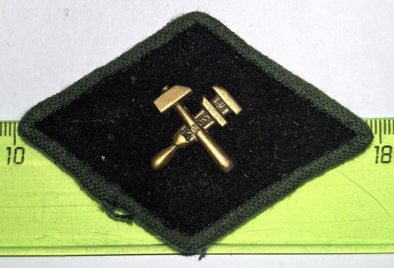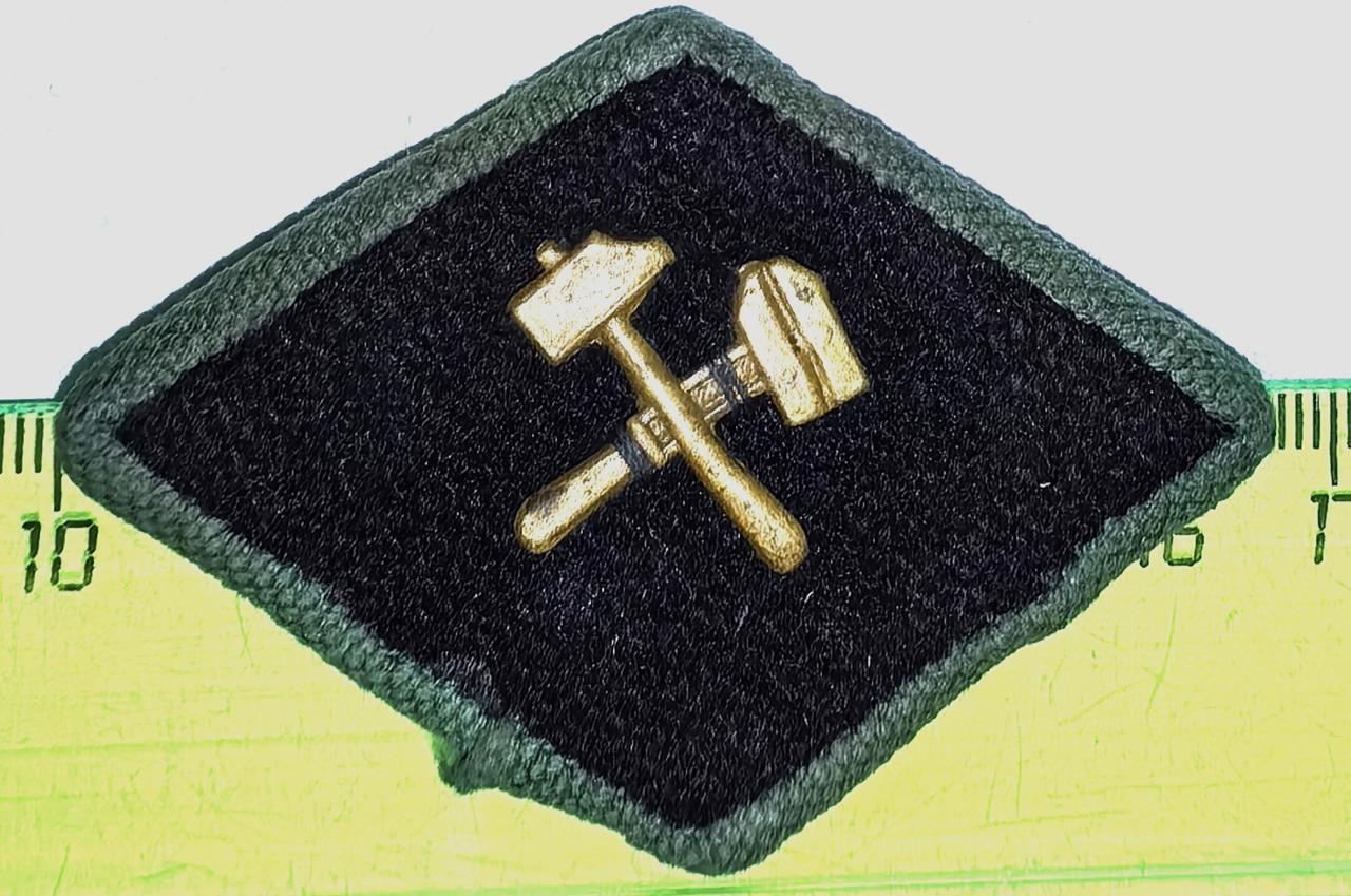 Две разновидности знака с разными размерами как самого ромба так и эмблем. Суконный ромб с кантом из зеленого х.б. сукна, в центре эмблема с французским ключом и молотом.