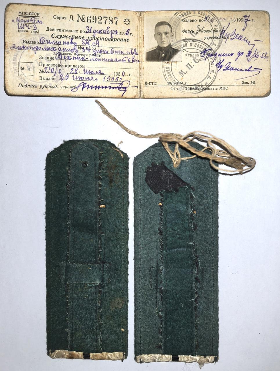 Данные погоны выставлены в виде в котором сохранились в семье (с отверстиями для звезд но без звезд). Стоит обратить внимание, что не смотря на принадлежность владельца к службе "Сигнализации и связи" эмблемы установлены "Административной службы".